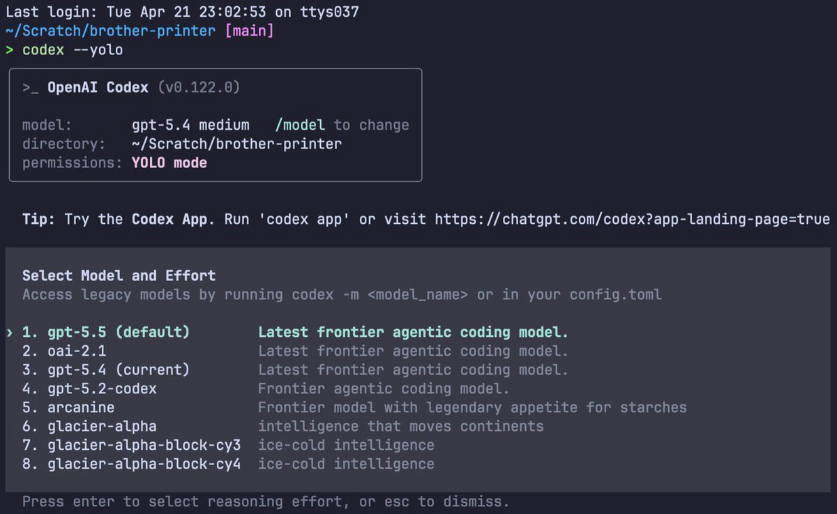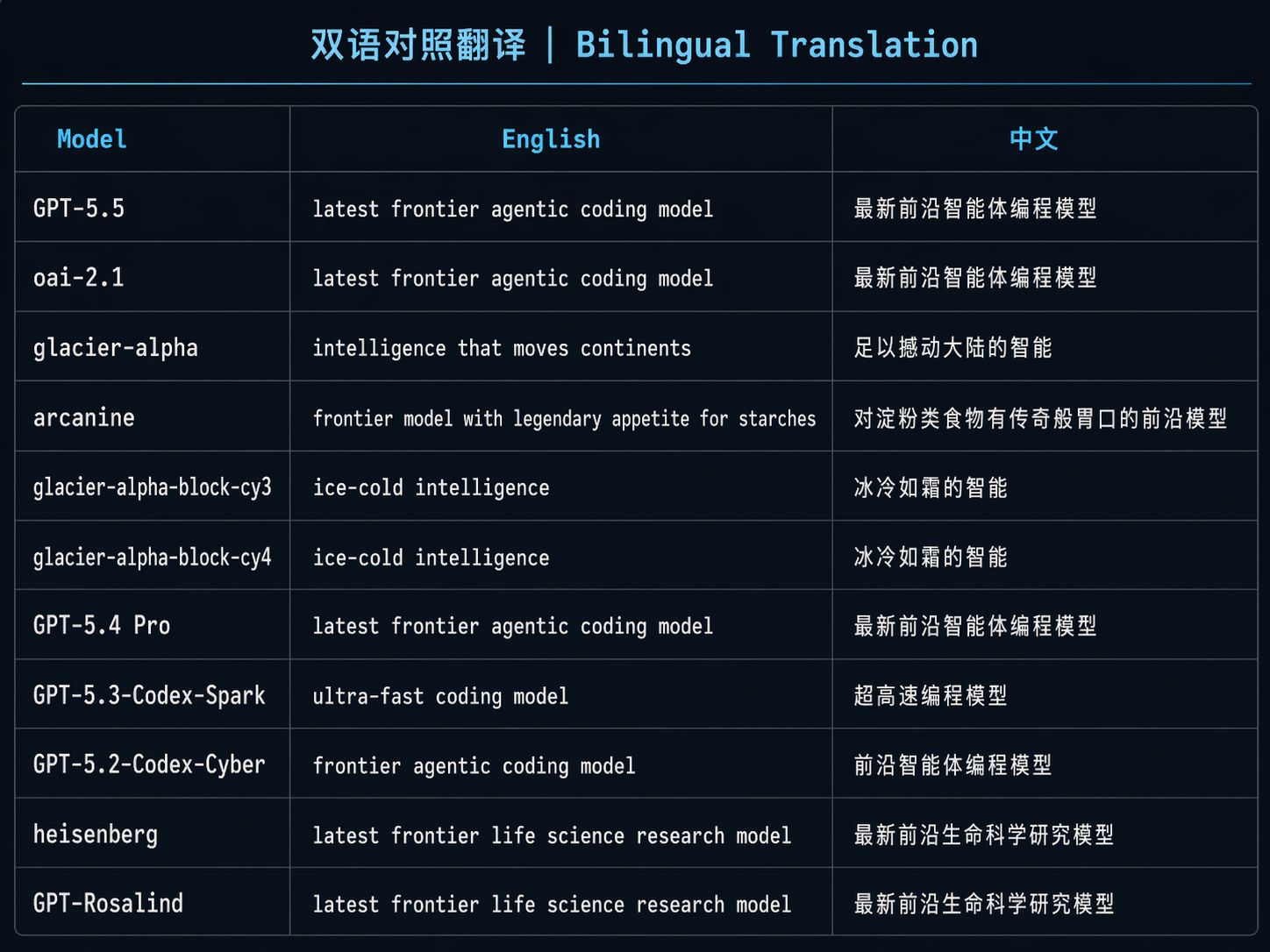 近期,OpenAI Codex 工具发生接口漏洞,导致 GPT-5.5 及多个内部模型代号短暂泄露,随后官方修复了该入口。其中,GPT-5.5 被标注为“最前沿的智能体编程模型”,同时曝光的还有 oai-2.1、heisenberg、arcanine 及 glacier-alpha 系列等代号。