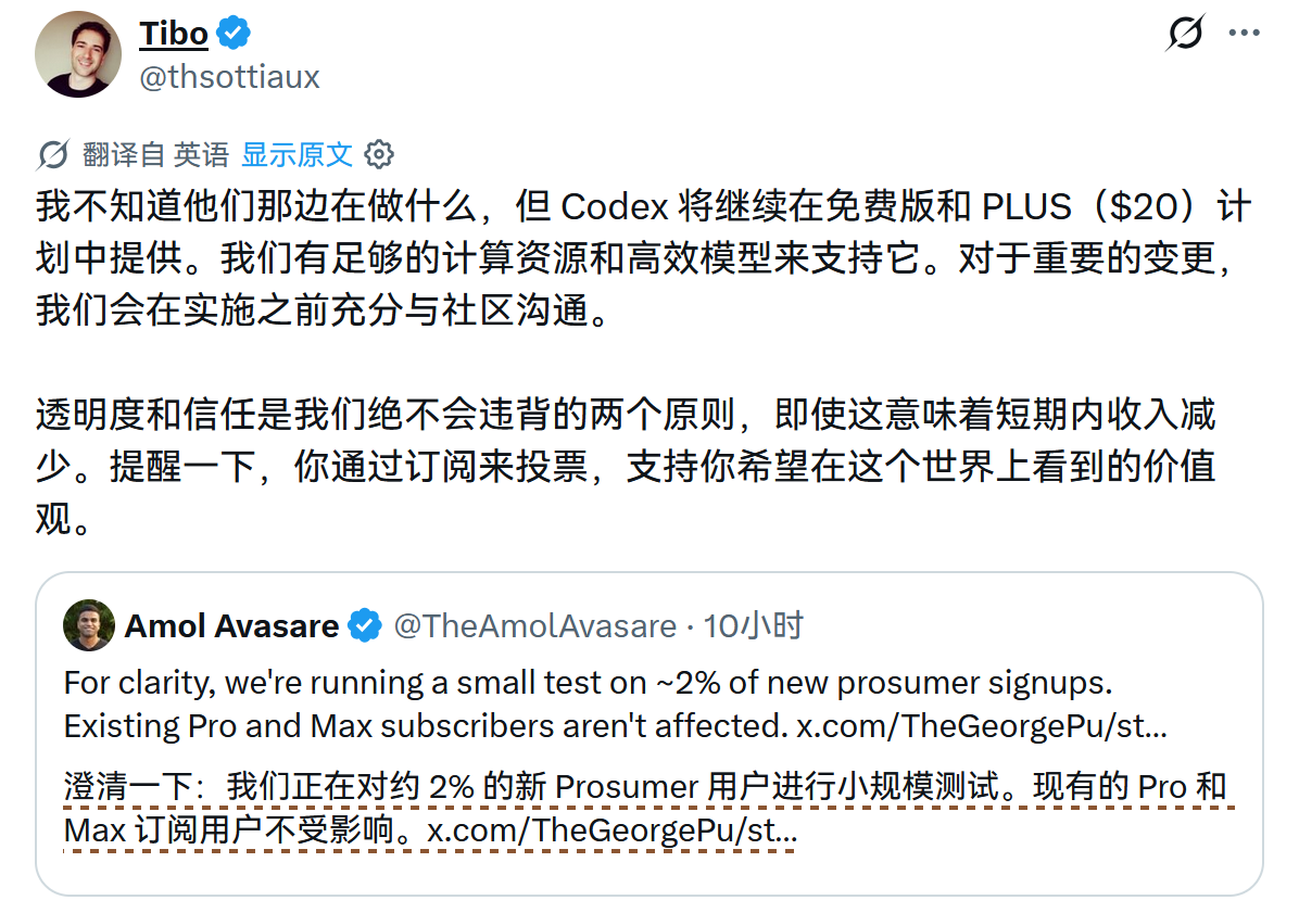 与此同时,Anthropic 官方确认正测试移除部分新 Pro 用户 Claude Code 访问权限。作为回应,OpenAI Codex 负责人公开承诺,Codex 将继续向 Free 和 Plus 用户提供服务,不会违背透明度与信任原则,并强调具备充足算力支持。