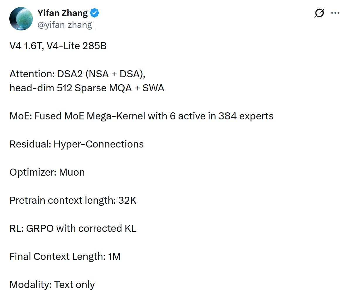在模型端,有非官方人员披露了即将发布的 DeepSeek V4 系列模型的详细规格参数。