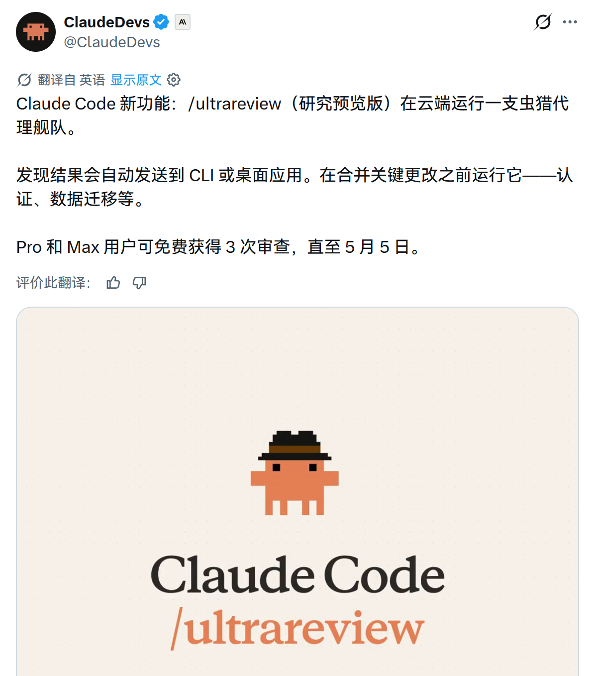 Claude 宣布,此前已推出的 Claude Code 功能 /ultrareview(研究预览版)现面向 Pro 和 Max 用户提供截止至 5 月 5 日 的 3 次免费审查机会。