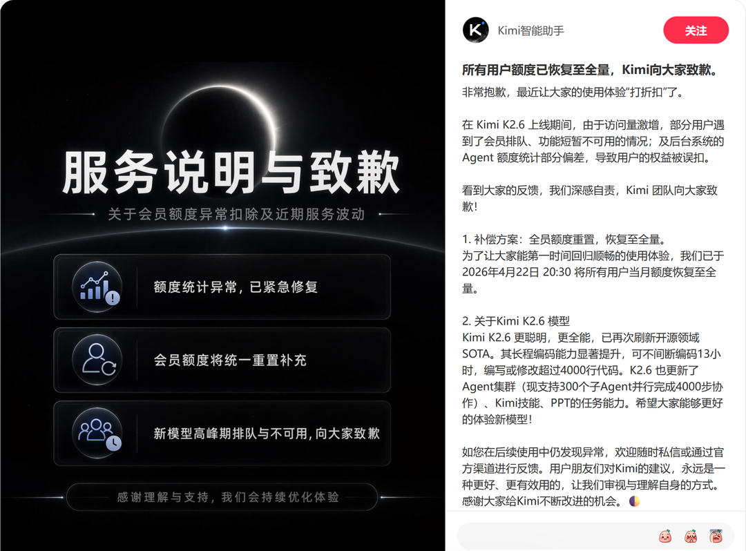 - Kimi 致歉 K2.6 上线波动并重置用户额度
