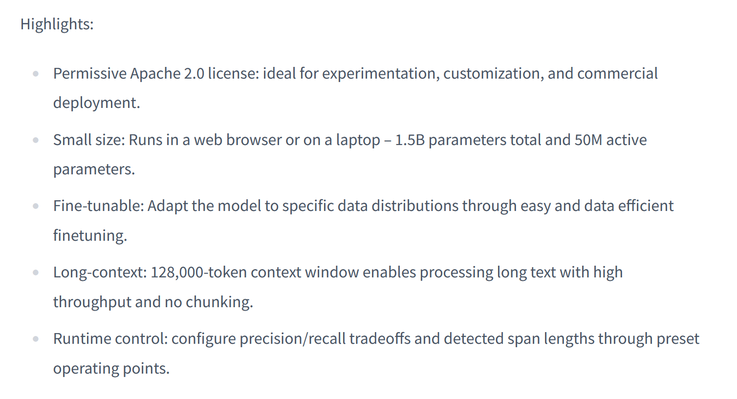 该模型采用了 MoE 架构,总参数量为 1.5B,激活参数为 50M,并支持 128k 上下文。由于体积小巧,该模型支持本地运行,甚至能够在浏览器中执行,从而确保敏感数据不会离开用户设备。