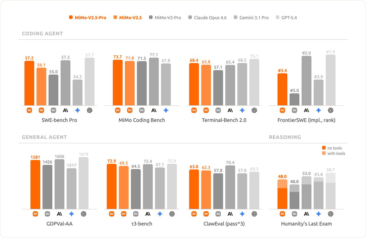 MiMo-V2.5-Pro专为复杂的长程Agent任务打造。官方数据显示其在通用智能体能力、复杂软件工程等维度已能媲美前沿闭源模型。而