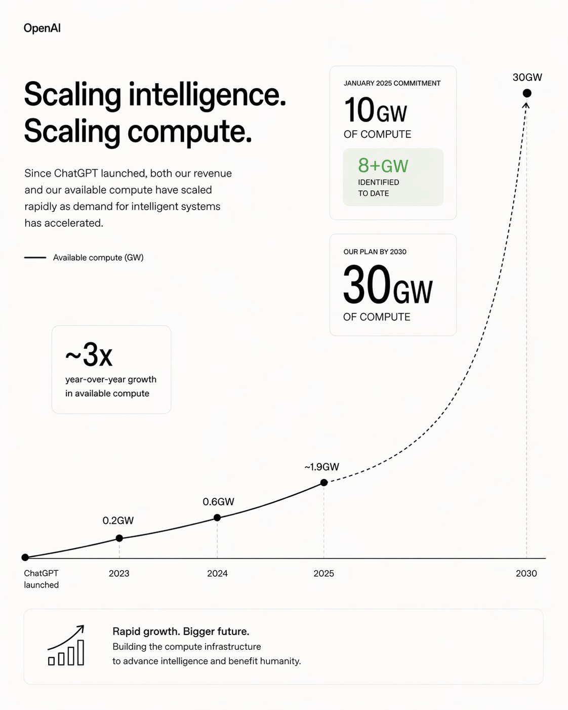 根据 OpenAI 官方发布的消息,OpenAI 正在规划到 2030 年实现 30GW 计算能力的新目标,以适应对智能系统快速激增的需求。
