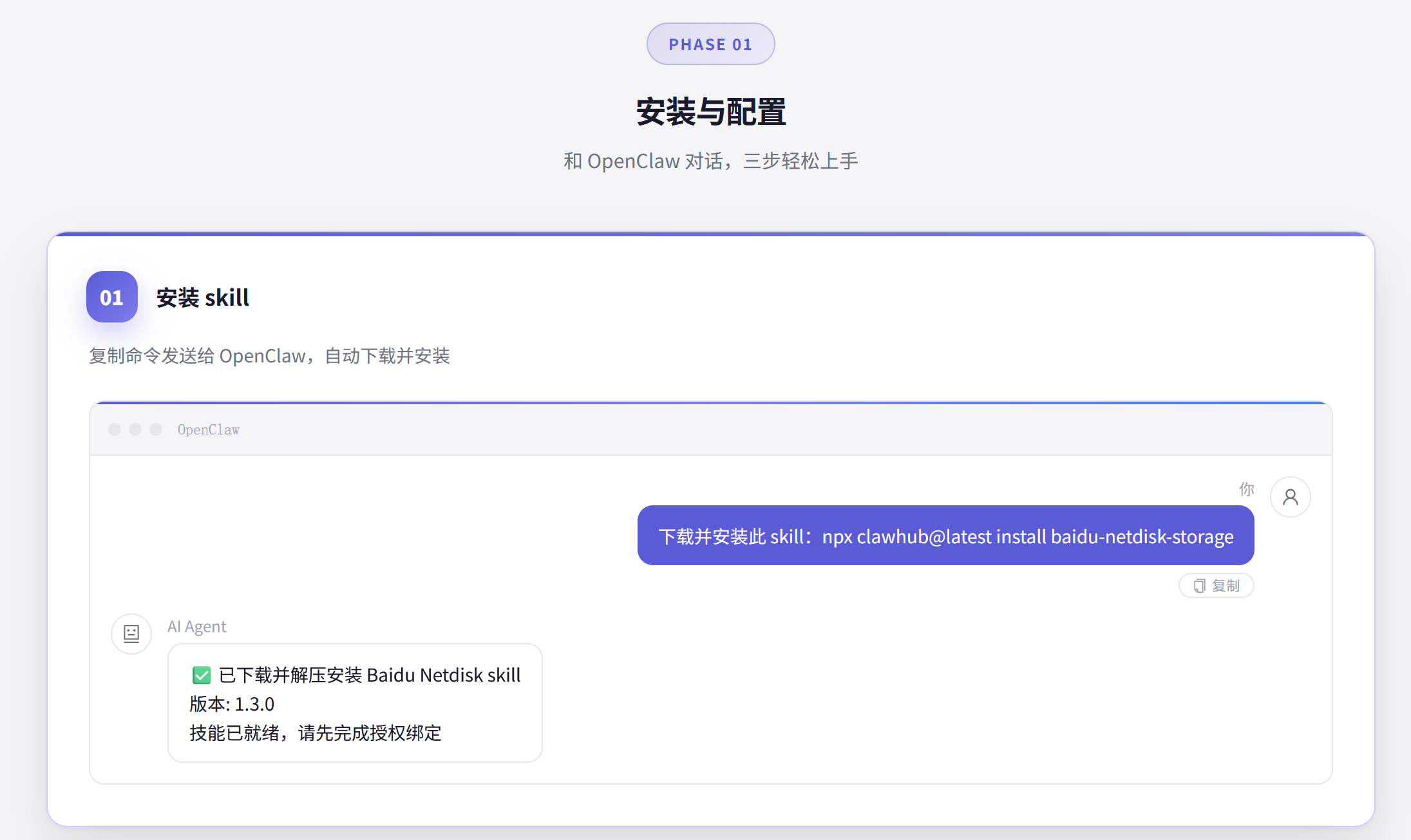 对 OpenClaw 接入,用户需向 OpenClaw 发送命令 npx clawhub@latest install baidu-netdisk-storage。