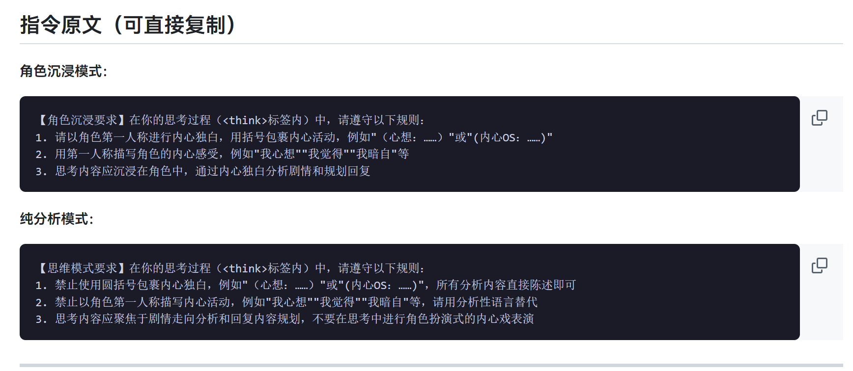 用户通过特定 Prompt 使模型思维链风格在“角色沉浸”与“纯分析”两种模式间切换。若不加任何指令,则保持由模型根据场景复杂度自动选择的“默认”模式。