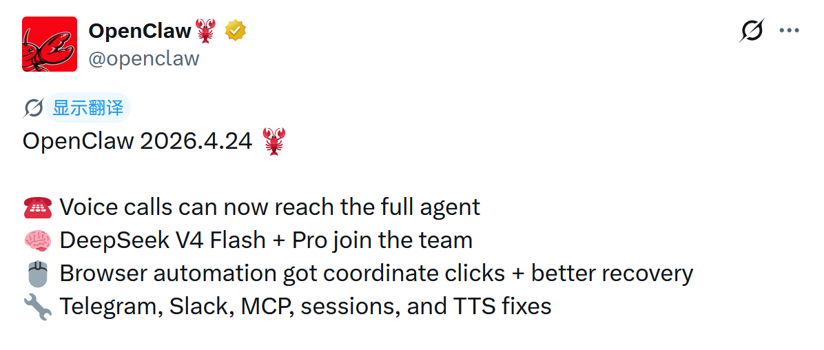 OpenClaw 官方宣布推出 2026.4.24 版本更新。
