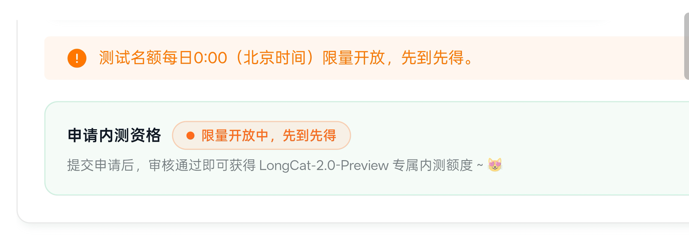 每日 0 点,在 longcat 开放平台上提供有限名额供用户申请。