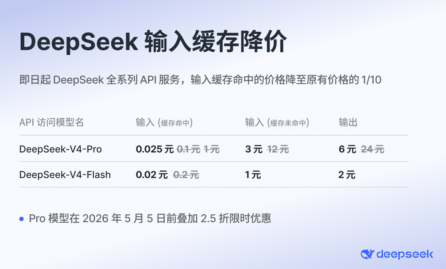 在双重优惠叠加下,DeepSeek-V4-Pro 当前的输入缓存命中计费降至 0.025 元。
