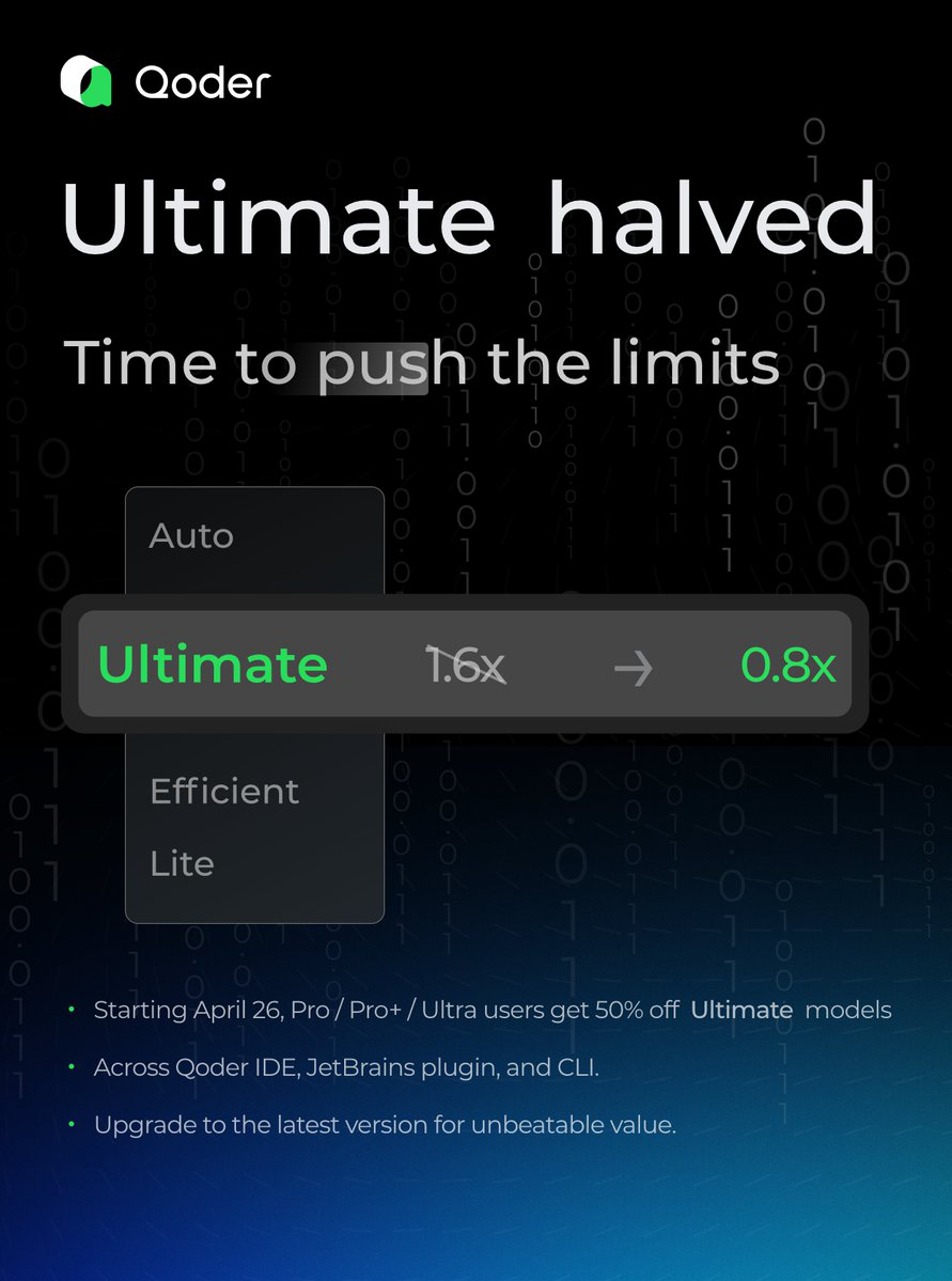 Qoder 官方宣布,其 Ultimate 档位模型从即日起价格减半,计费倍率从原价 1.6x 降至 0.8x。