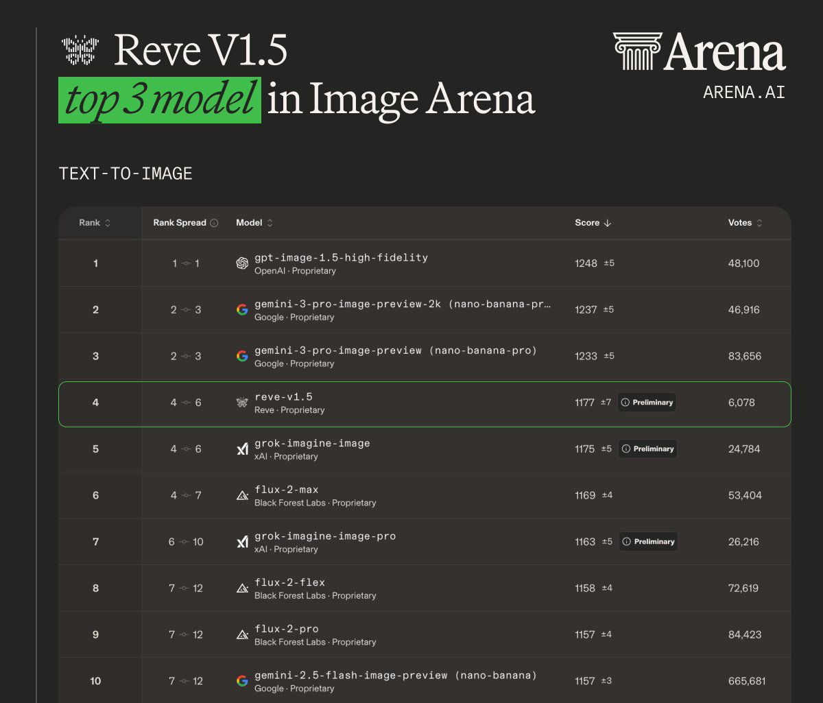 Reve 发布首款文生图模型 Reve V1.5 早期版本,在 Arena 竞技场以 1177 分位列总榜前三或第四,性能与 Grok-Imagine-Image 持平,并在文本生成类别进入前五。该模型支持原生 4K (16MP) 分辨率,技术架构采用原生像素空间扩散方案,未依赖潜在自编码器,并优化了预训练与后训练流程。据官方计划,近期将引入图像编辑功能。