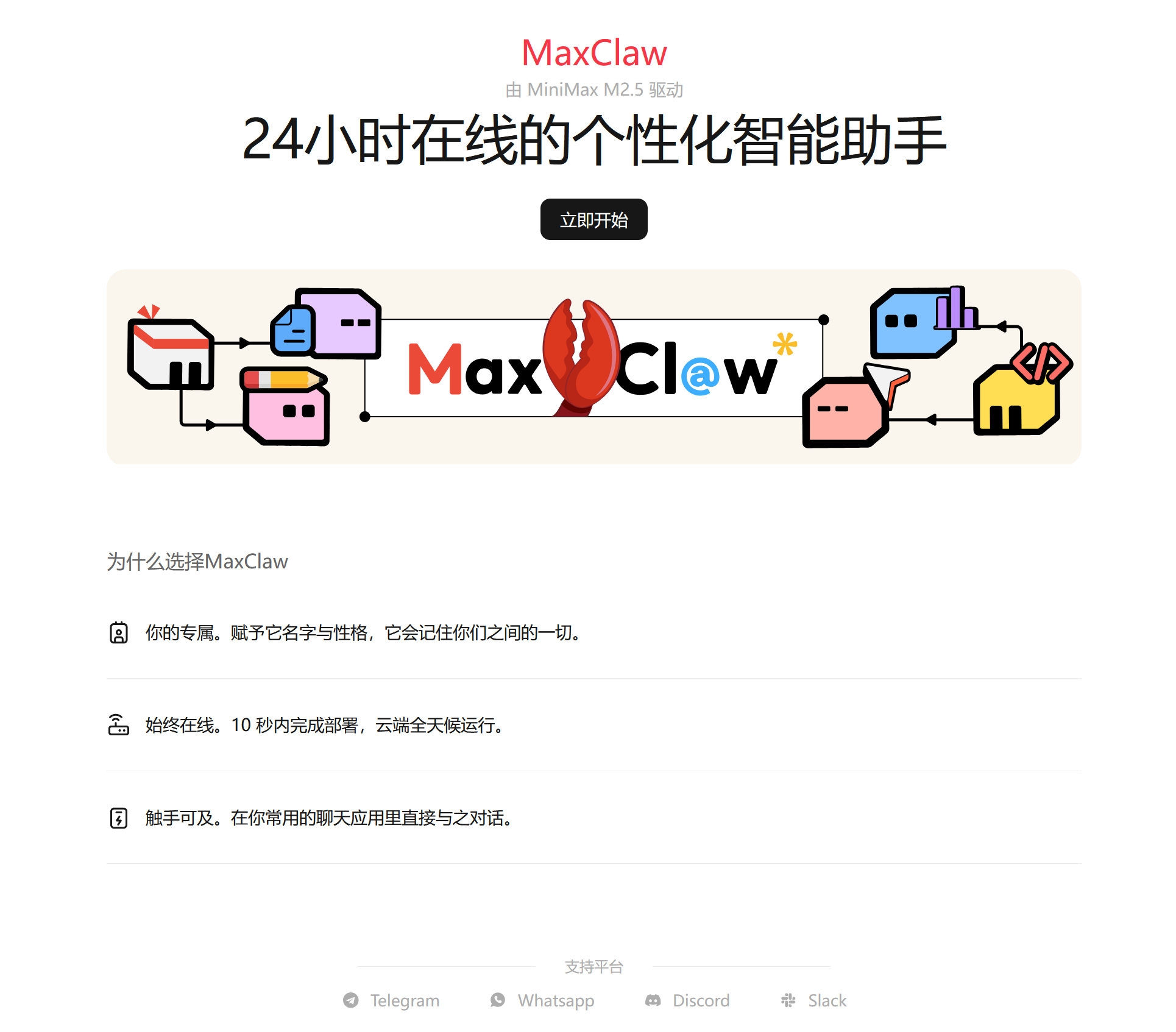 MiniMax 正式推出 Agent 平台新功能 MaxClaw,为 OpenClaw 框架提供云端一键部署服务。据官方公告,该服务主打“即时上线、零维护”,用户无需管理服务器,仅需 10 秒 即可完成部署。MaxClaw 深度集成 M2.x 系列模型,支持将 Agent 部署至 Discord 及 Slack 等平台。此外,该功能支持个性化配置与对话记忆机制,用户可设定 Agent 名称与性格,Agent 将通过持续学习以理解用户。