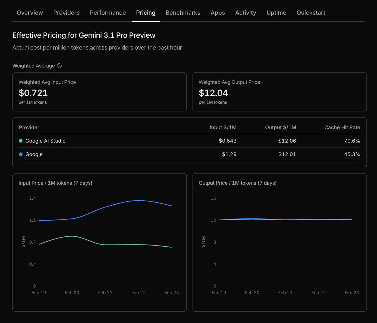 OpenRouter近期推出名为“Effective Pricing”的新功能,旨在让用户直观查看不同供应商针对同一模型的实际平均成本。该成本综合考量了供应商的缓存价格与缓存命中率计算得出,并动态反映其随时间的变化趋势。根据官方信息,用户可通过点击任何模型页面上的“Pricing”标签浏览数据。OpenRouter官方特别指出,该功能对于闭源模型(例如 Gemini 3.1 Pro Preview)的评估尤为关键,因为不同供应商针对这些模型的缓存命中率存在显著差异。