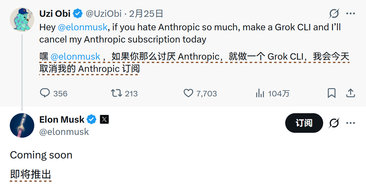 Elon Musk 在社交平台 X 上回应网友 @UziObi 时确认,Grok CLI 即将推出。
