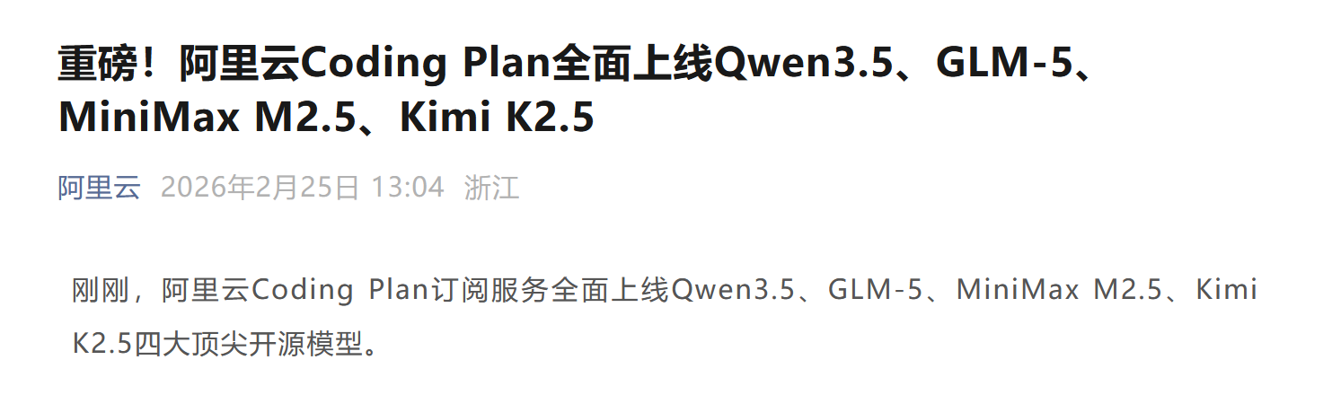 #6 - 阿里云百炼Coding Plan上线第三方开源旗舰模型 ↗